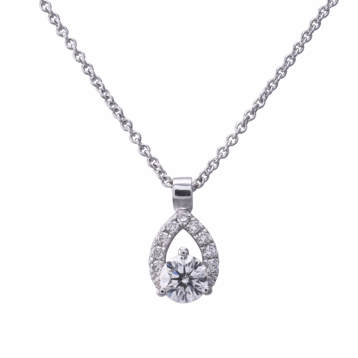 This drop-shaped diamond halo necklace expresses softness through precision.