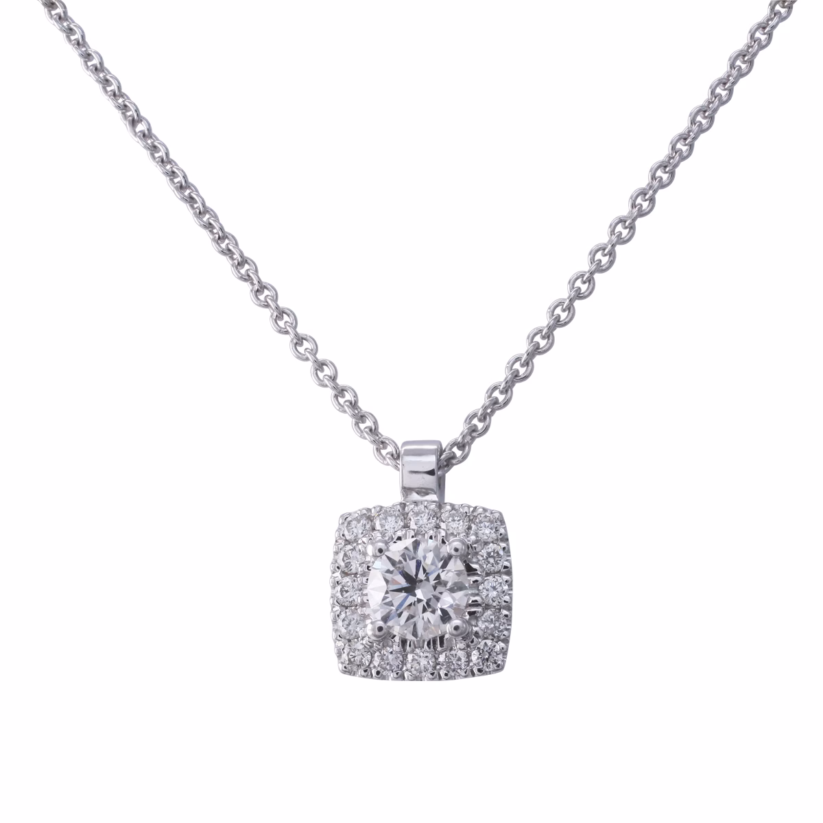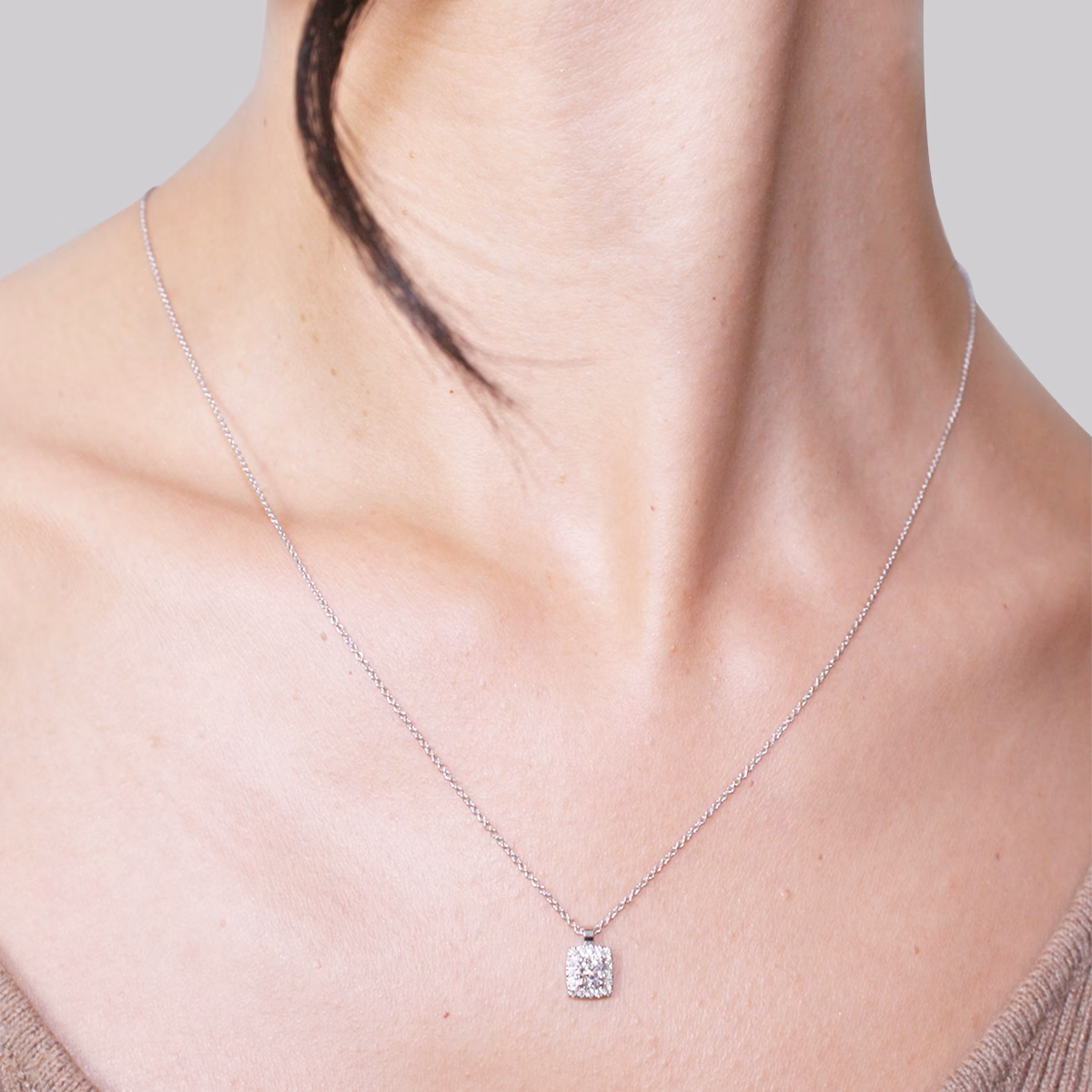 A square diamond halo necklace in 18k white gold featuring a 0.20ct VS G diamond. Clean lines and calculated light reflection.
