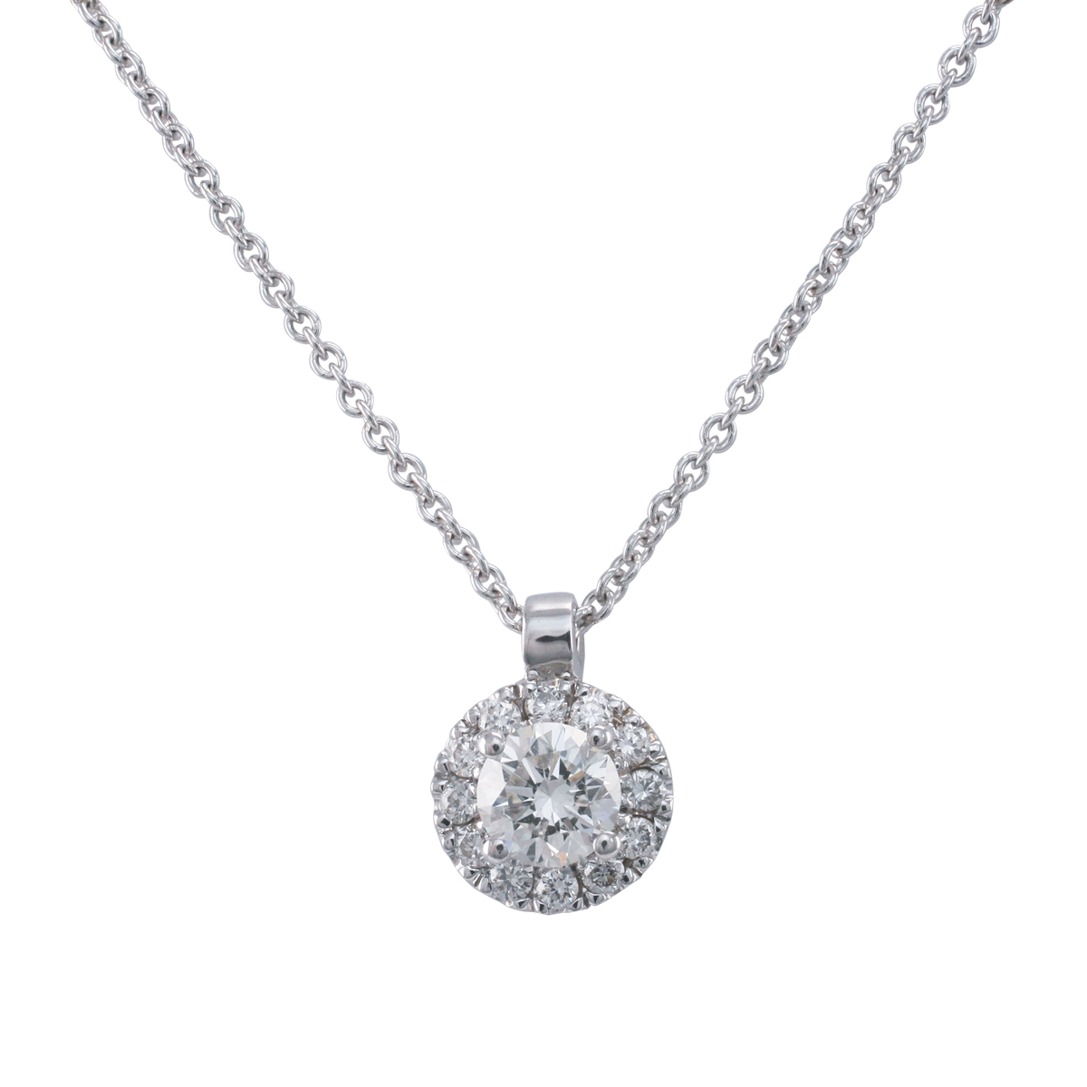 Crafted in 18k white gold, a brilliant round-cut diamond of approximately 0.20ct is surrounded by a precisely inclined halo of fine diamonds, designed to reflect light inward toward the center stone.